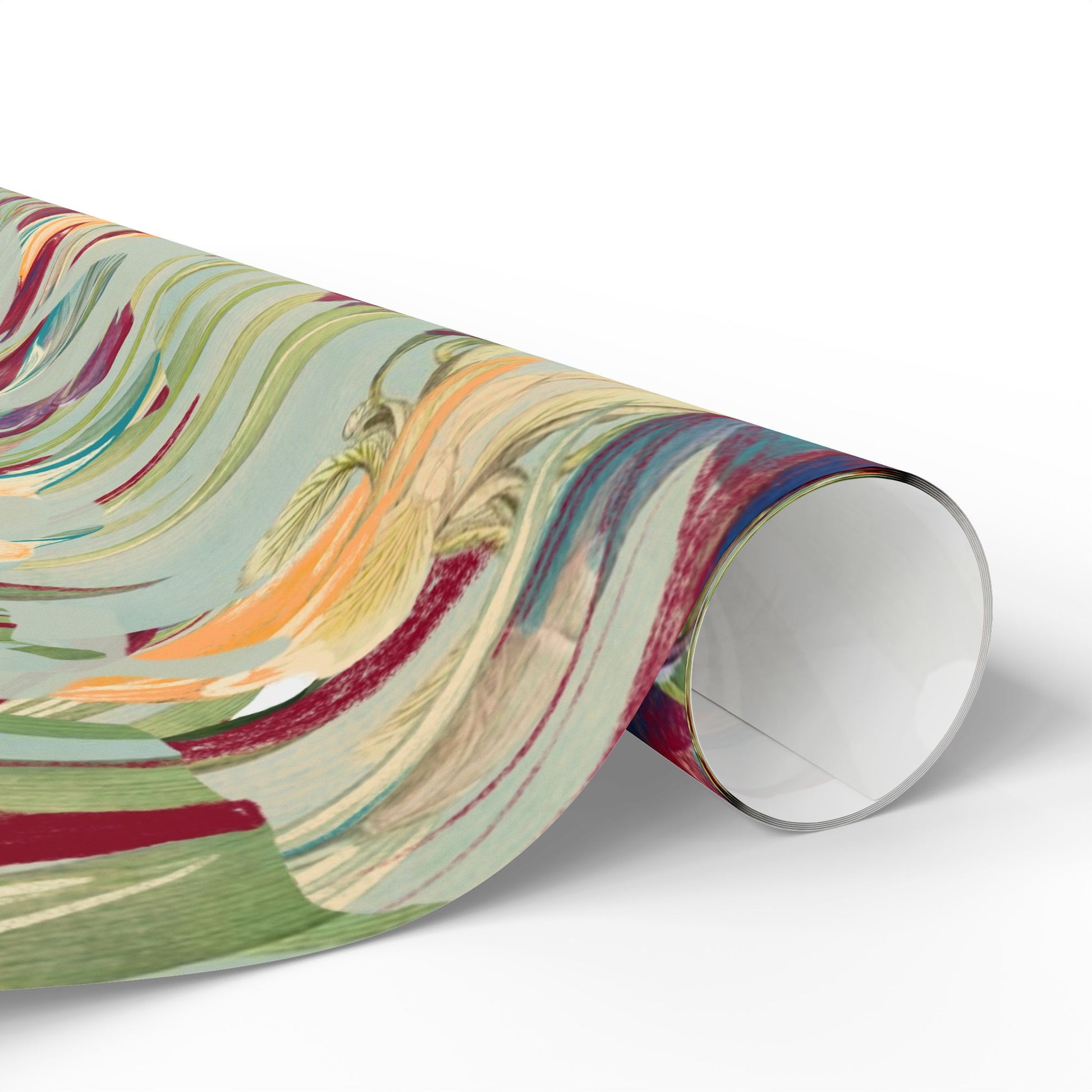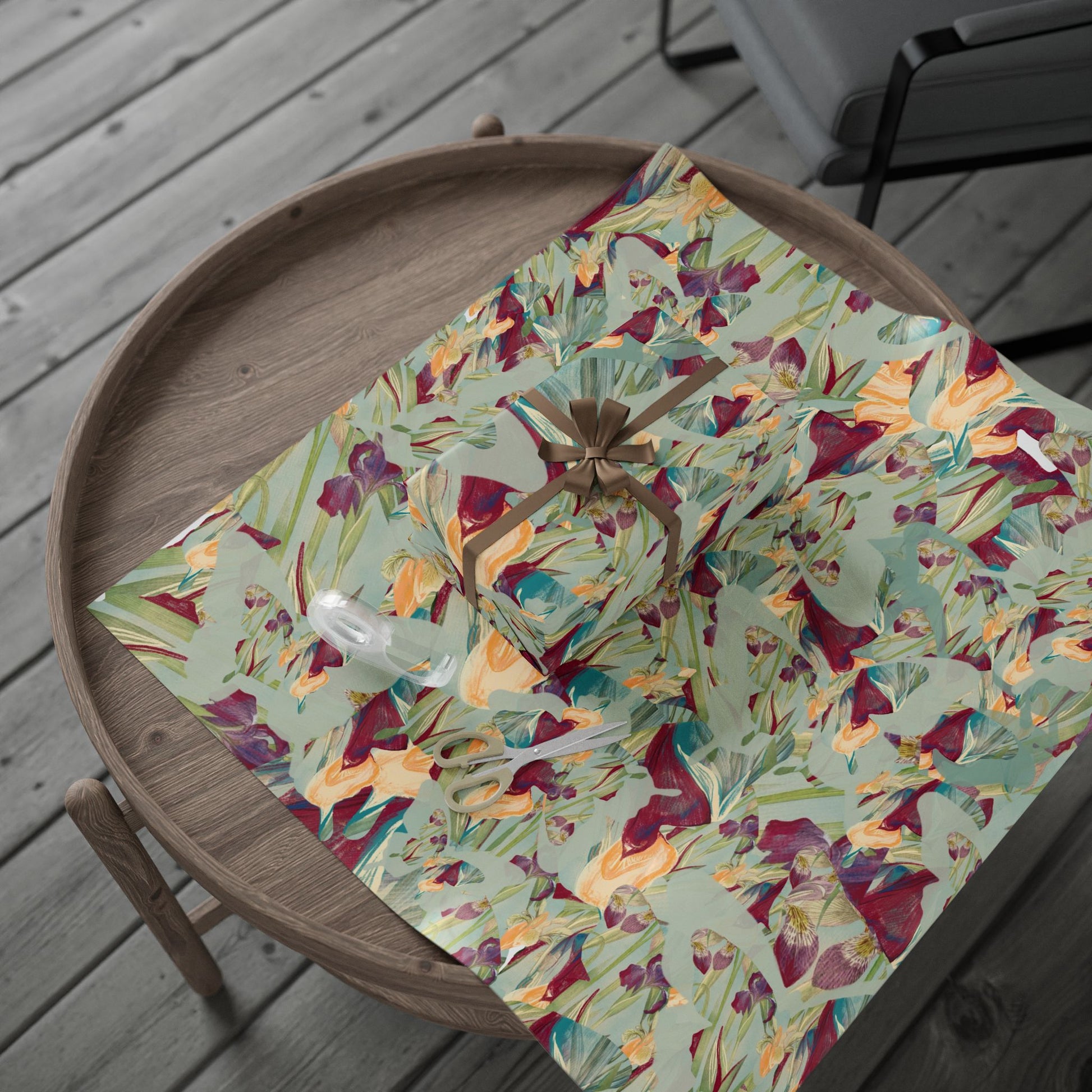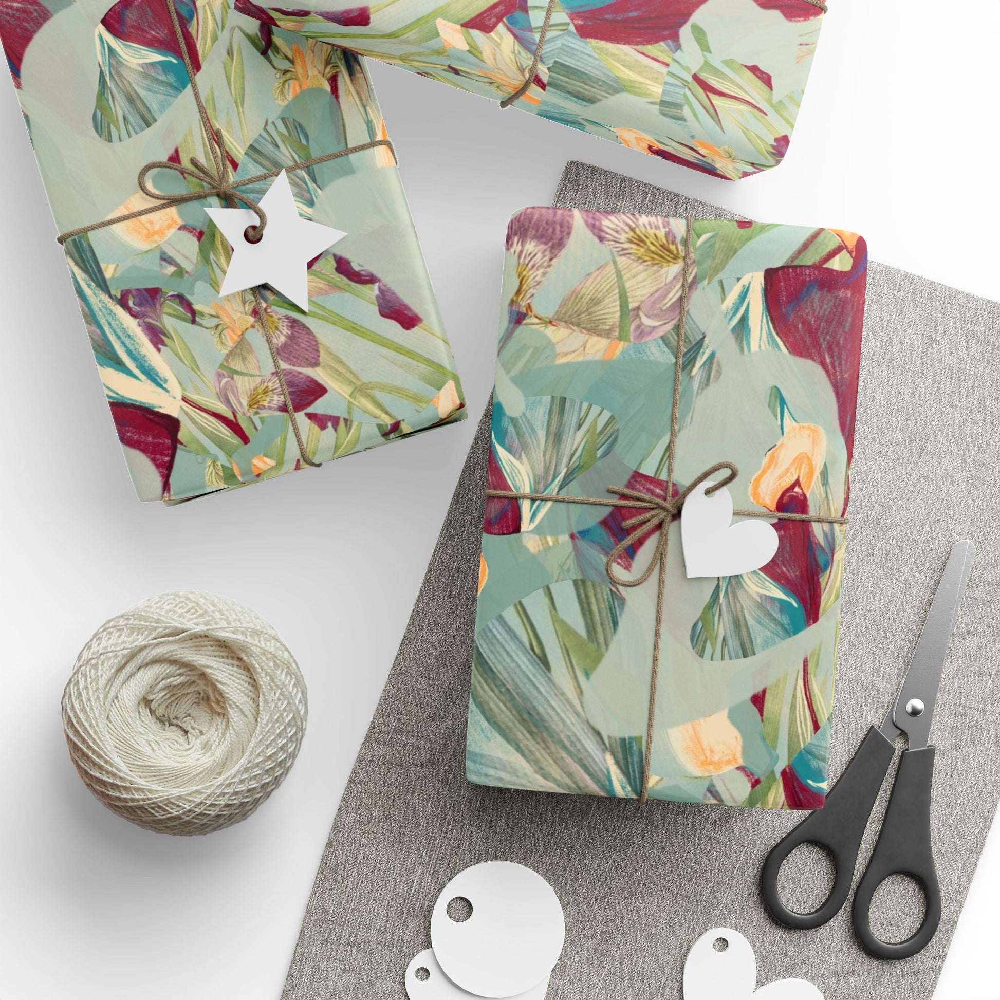 Soft, painterly blooms sweep across a mint-green field in this artful wrapping paper. The design reads like a hand-brushed botanical study — layered leaves and abstract florals in warm apricot, deep berry, and muted teal. It adds a thoughtful, gallery-ready touch to birthday parcels, housewarming bundles, or any moment when presentation matters. Printed on substantial 90 gsm fine art paper with a choice of glossy or smooth matte finish, the paper lays flat and drapes beautifully around boxes and bouquets. Note the design prints one-sided and includes a small white trim with barcode and QR code along the edge.