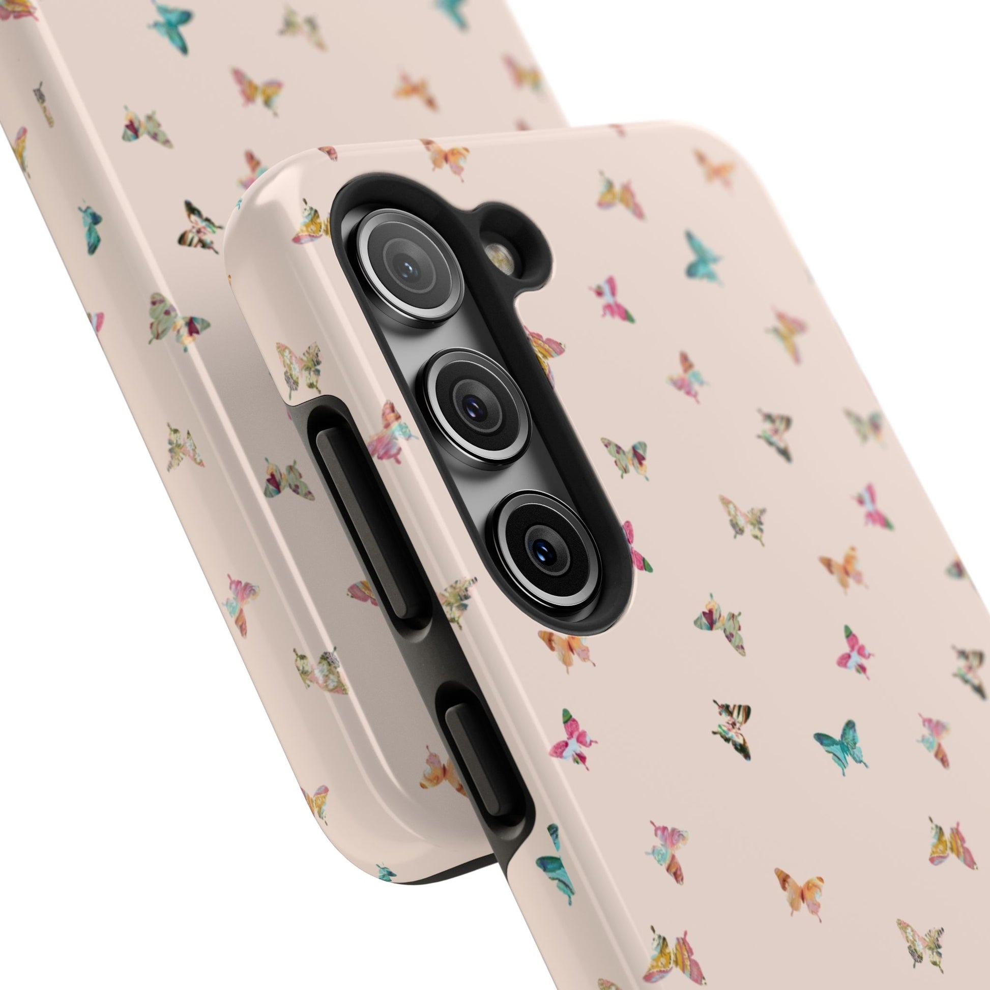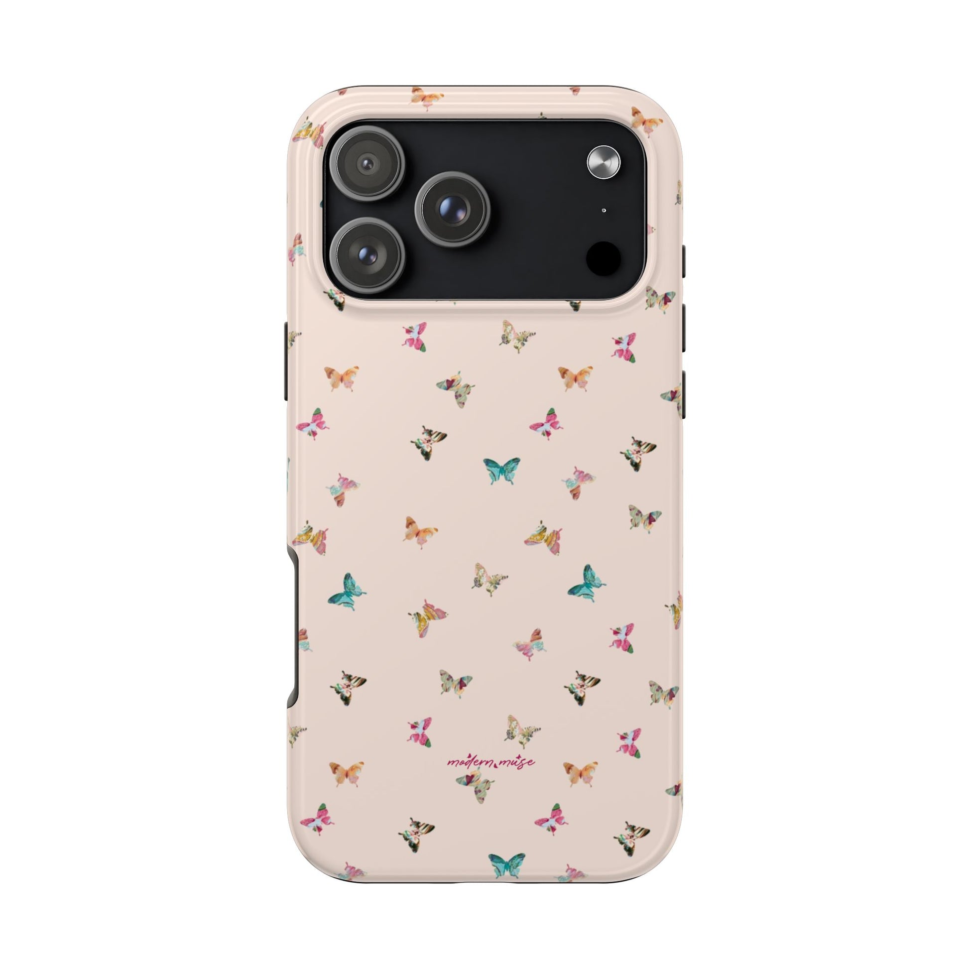 A slim, protective phone case that brings a gentle flutter of color to your everyday carry. The soft blush background is scattered with delicate, watercolor butterflies in teal, coral, and warm neutrals — small, joyful details that peek out whenever you pick up your phone. Built with a two-piece construction and a flexible rubber liner, this case takes the shock of bumps and drops so you don’t have to worry. The glossy finish enhances the artwork’s subtle sheen and the UV protection keeps colors bright through sunlit days. It’s light in your hand, lays flat to protect your screen, and supports wireless charging so the case stays practical as well as pretty.