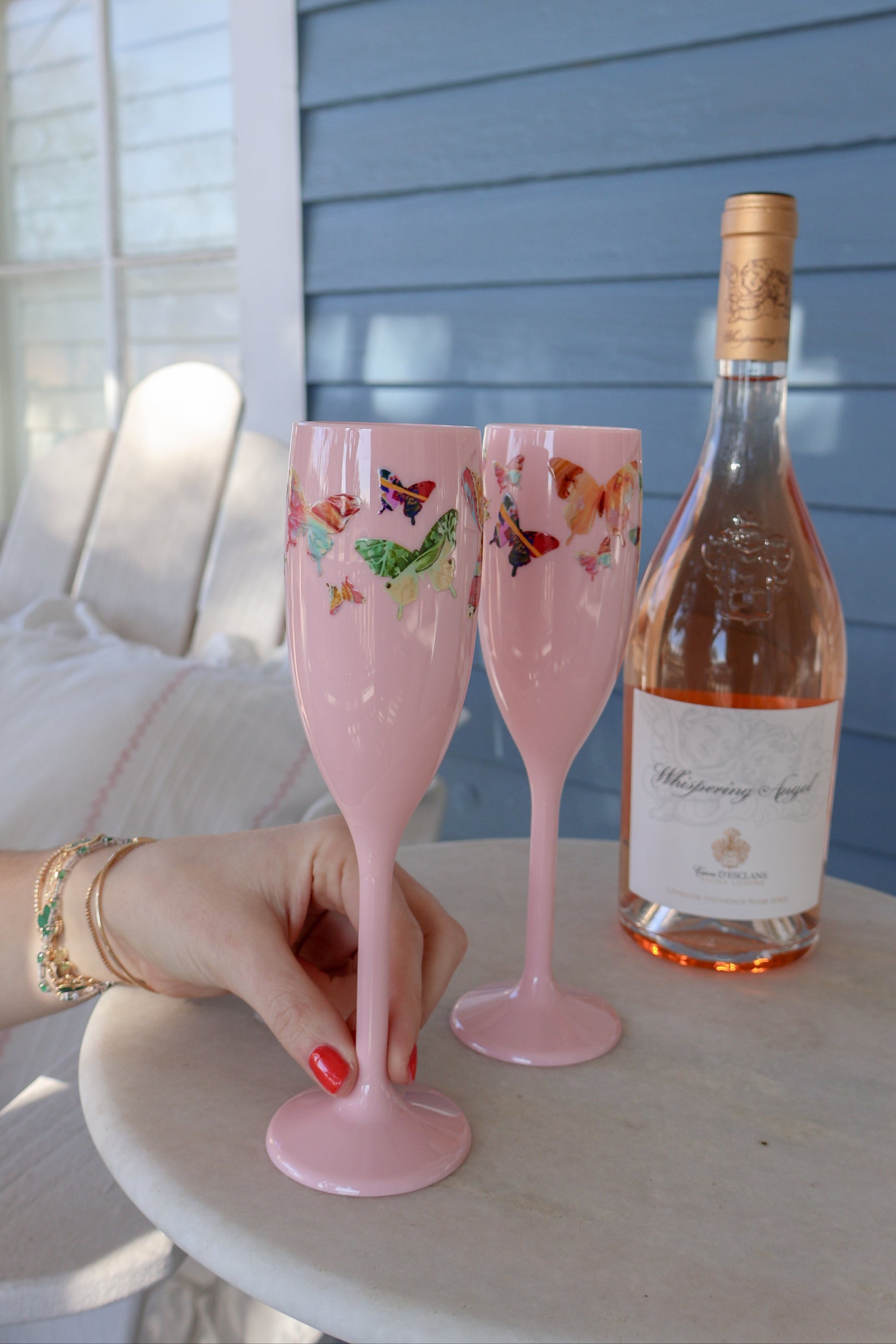 Handmade light pink champagne flutes with our butterfly designs